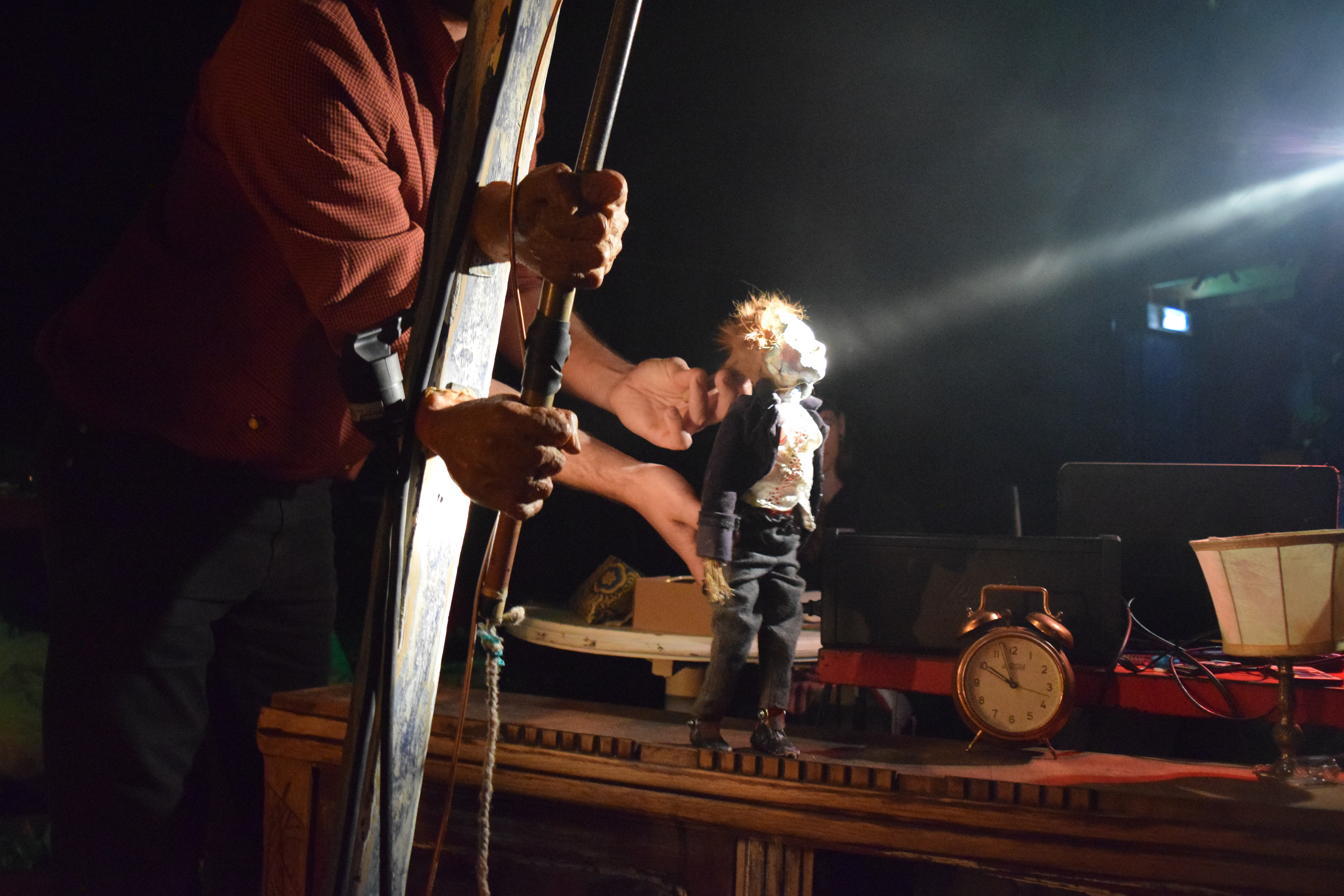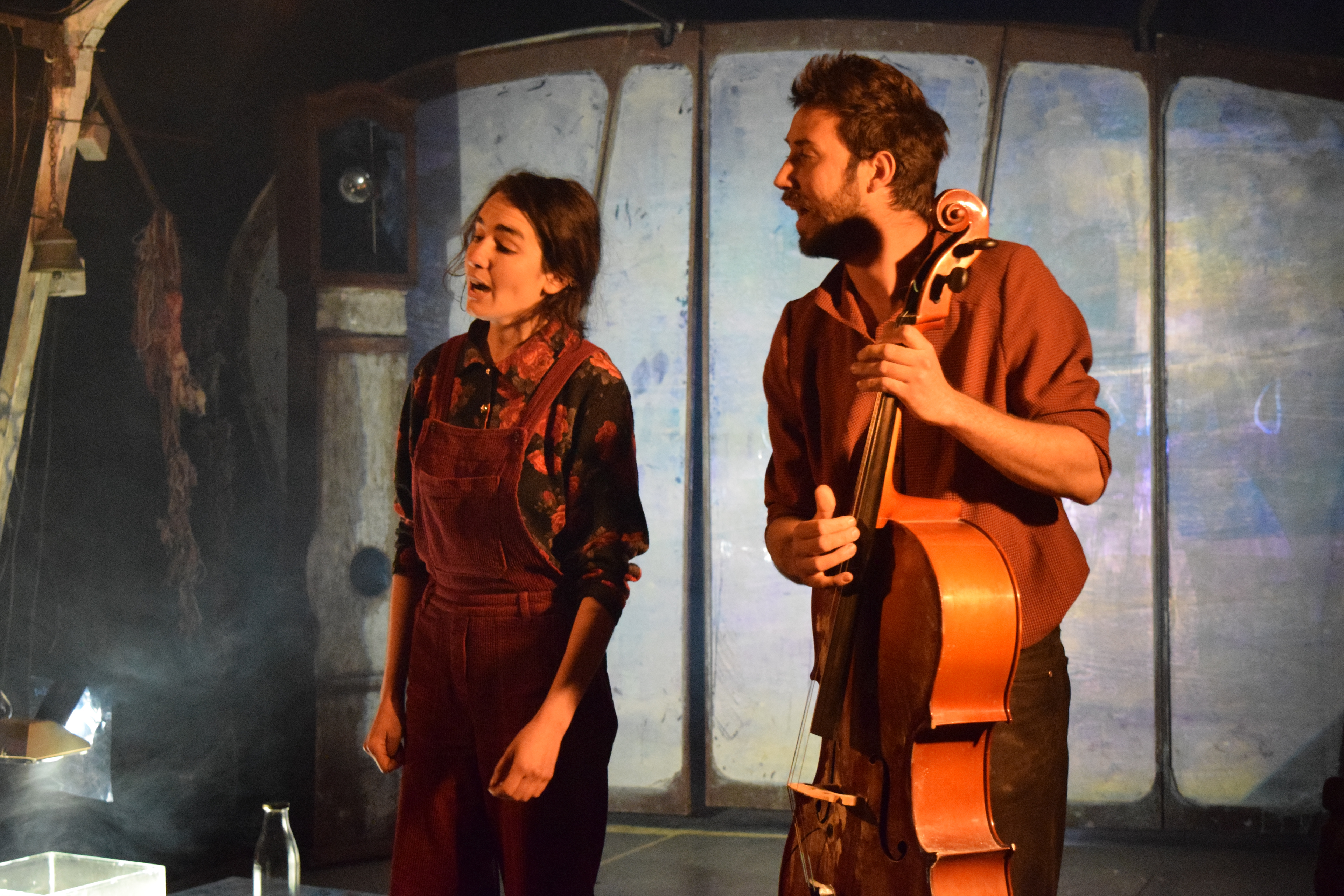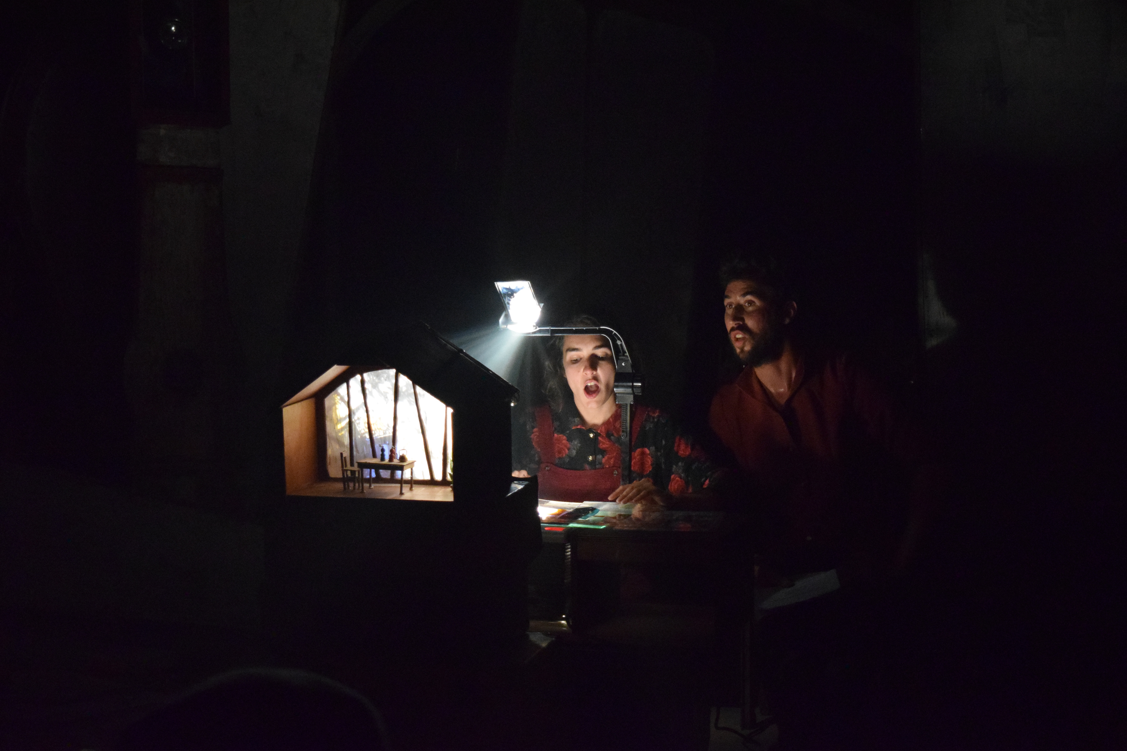 Ainsi, l’histoire se déploie à vue d’œil. Elle se fabrique, en direct, sous le regard du spectateur; s’écoute, se distord, s’invente et se déforme, sous le geste de deux personnes au plateau.