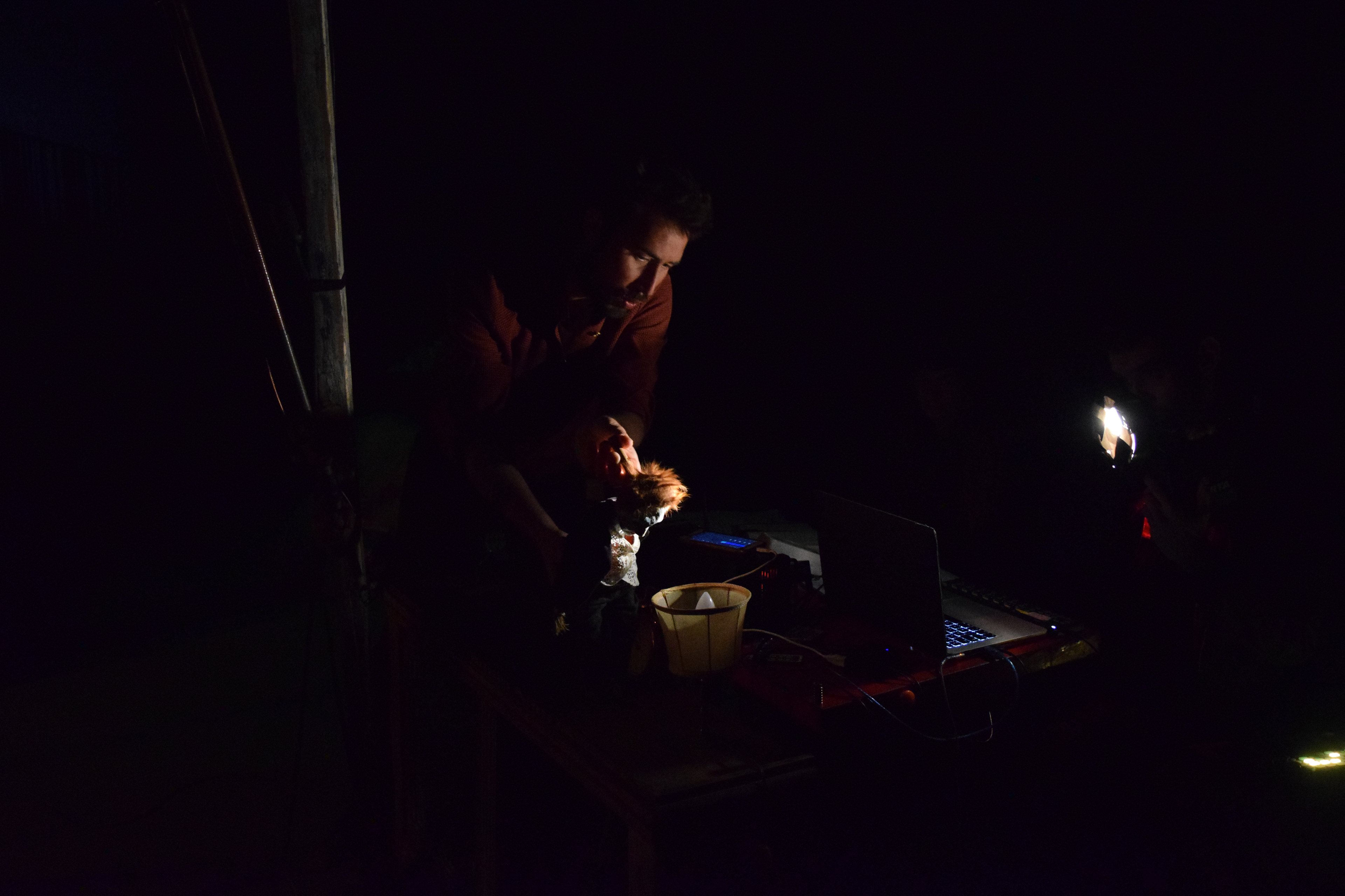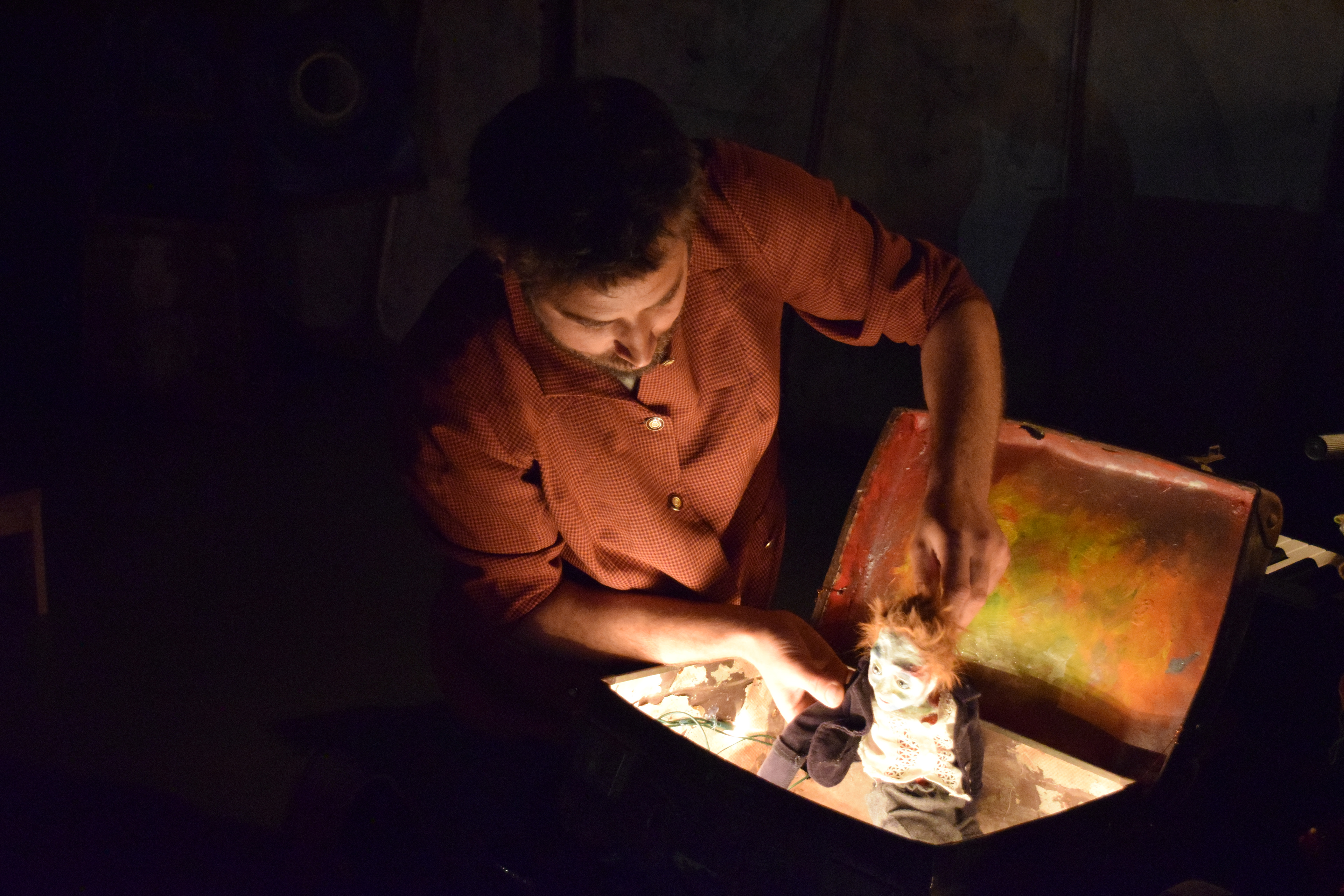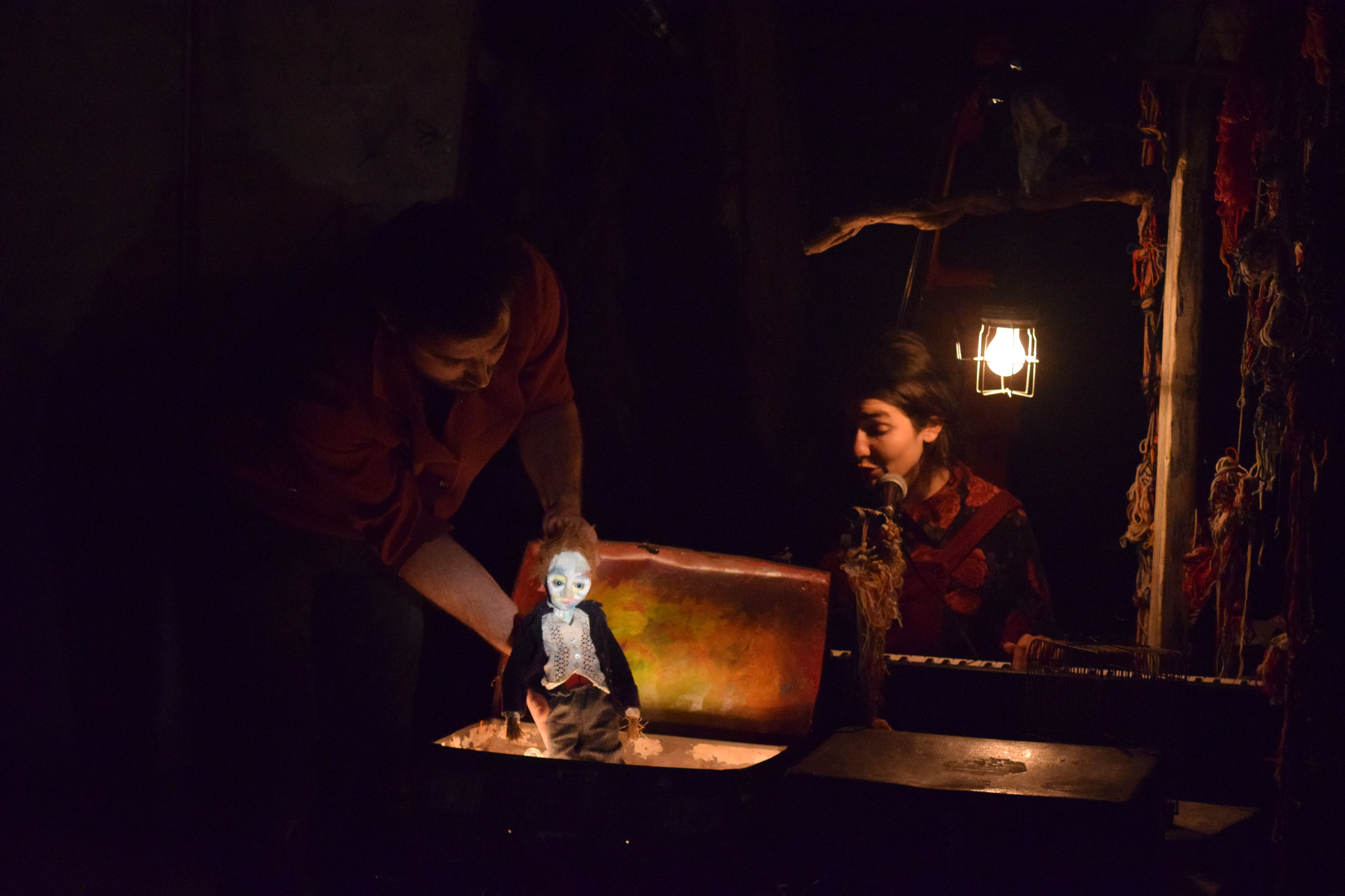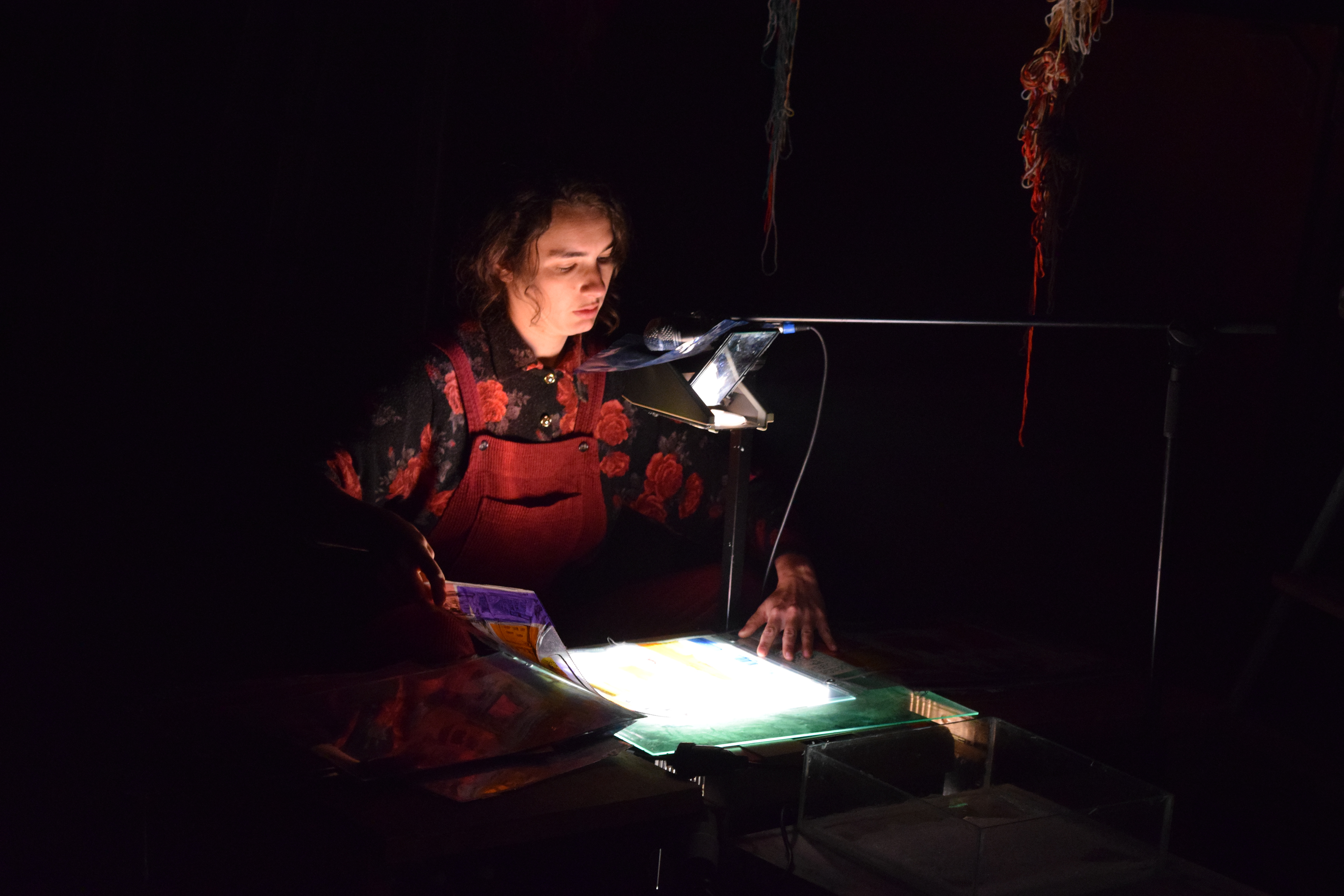Ainsi, l’histoire se déploie à vue d’œil. Elle se fabrique, en direct, sous le regard du spectateur; s’écoute, se distord, s’invente et se déforme, sous le geste de deux personnes au plateau.