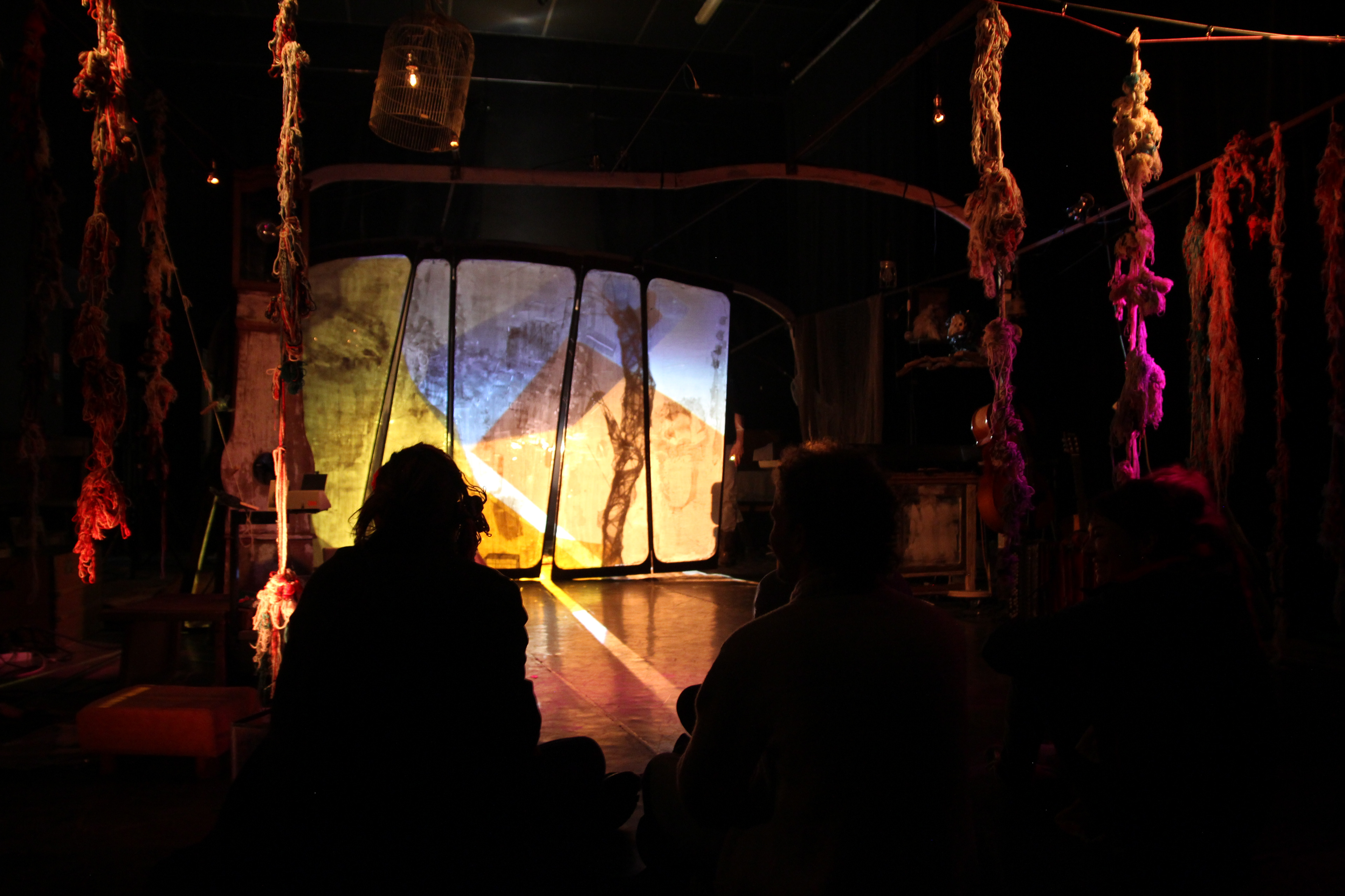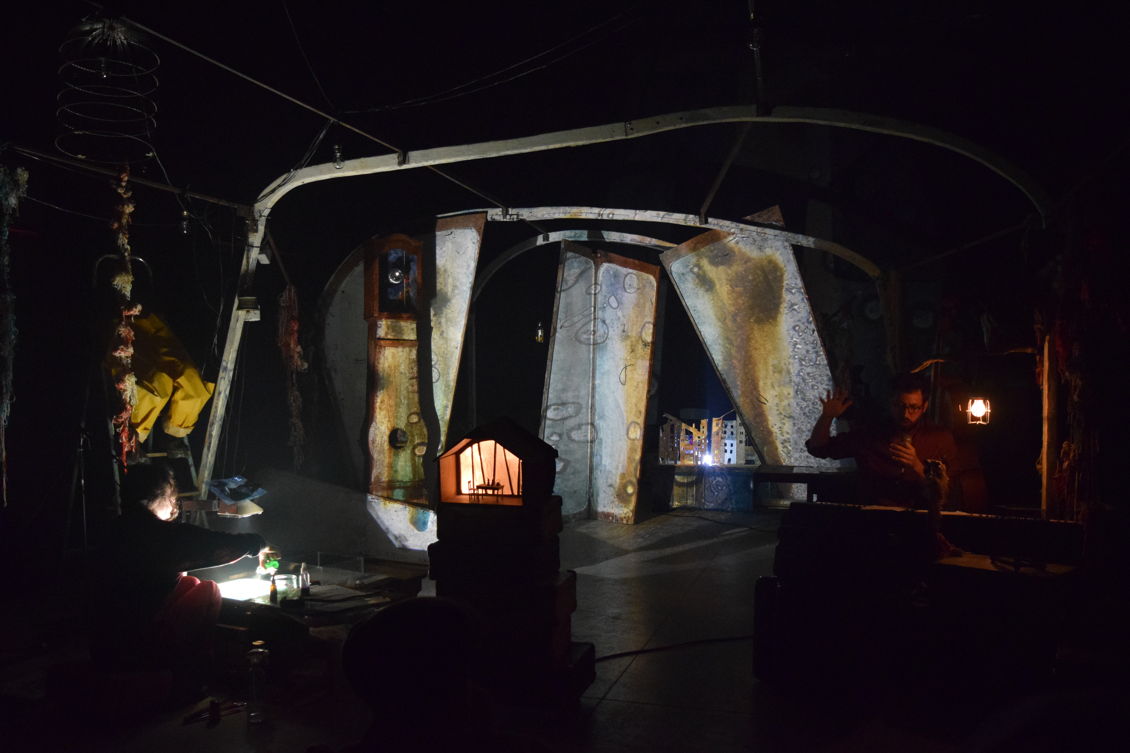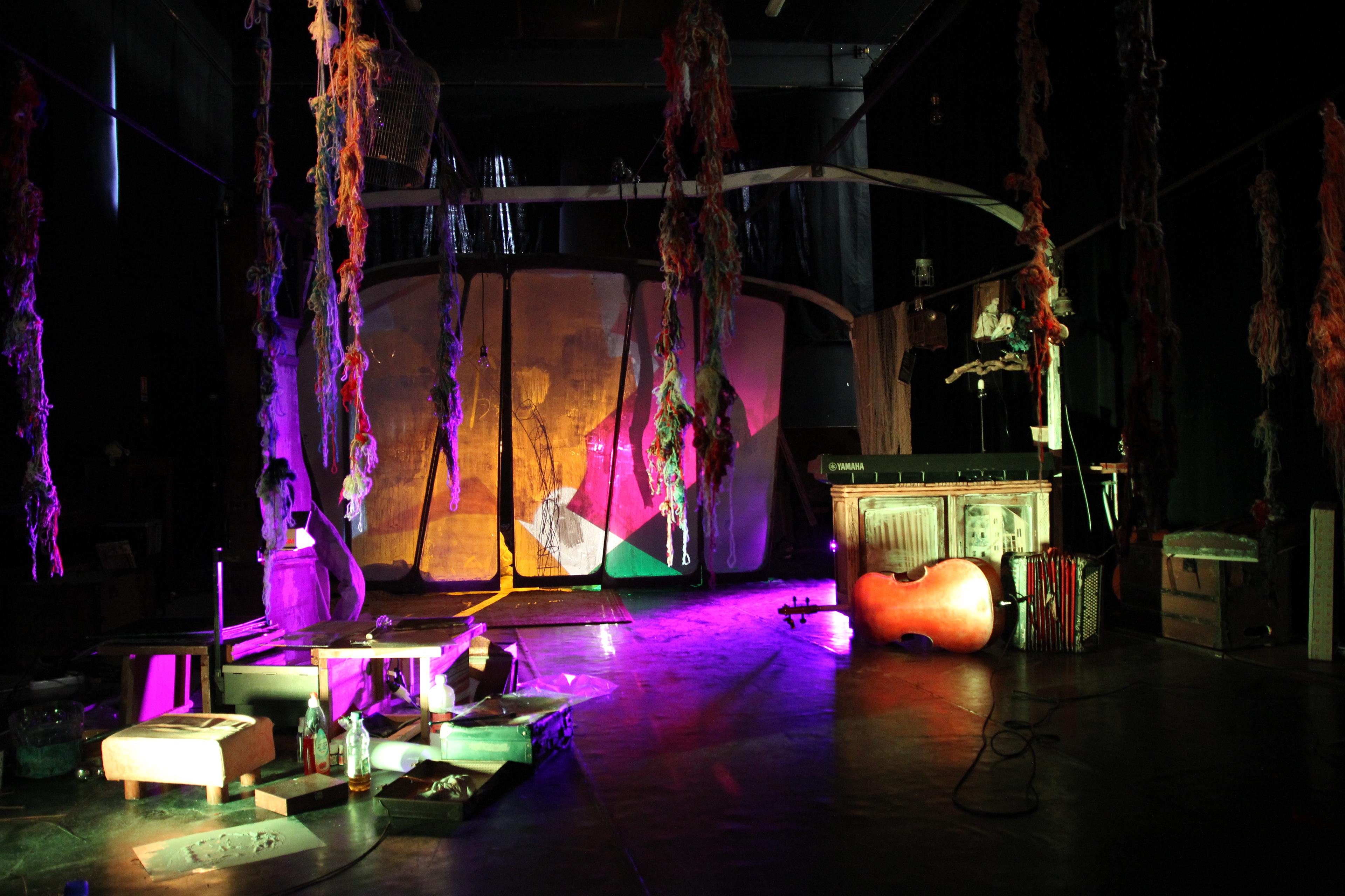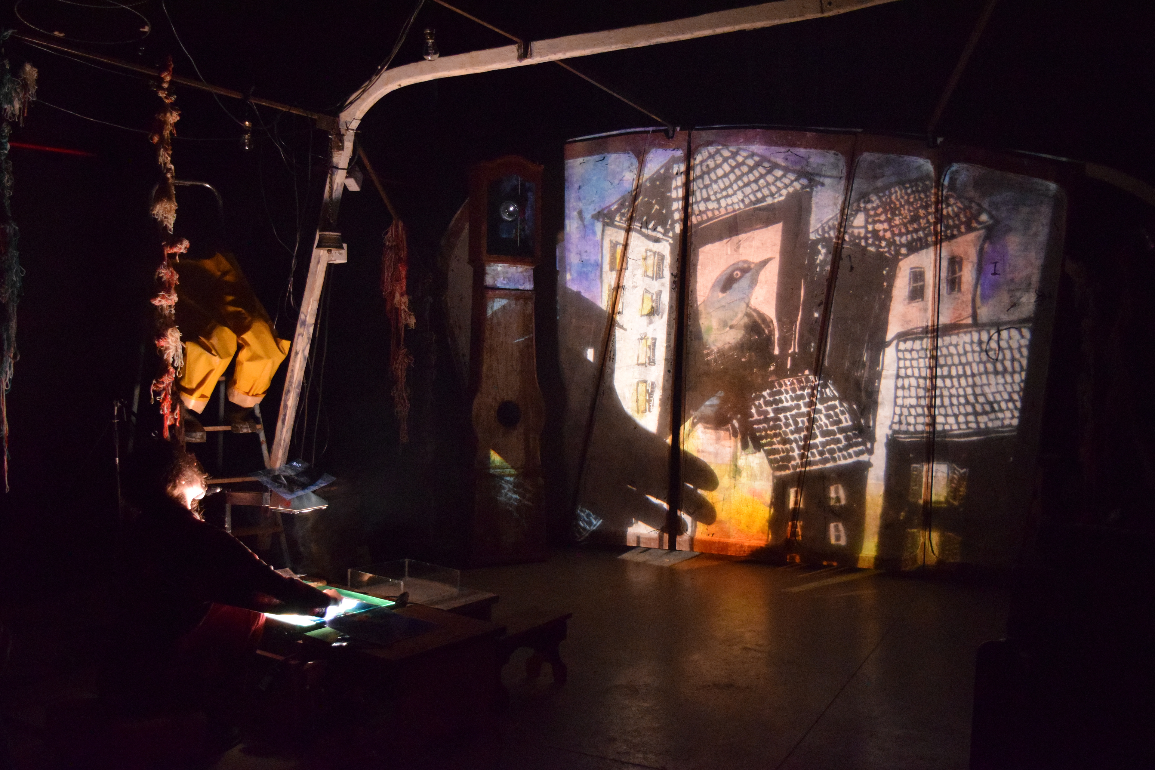 L'espace du spectacle de « Celle qui dit qu’elle a perdu son nom » ressemble autant à une cabane contre laquelle le vent aurait trop soufflé, qu’au squelette d'une baleine biscornue qui nous aurait proposé un abri. Les visiteurs entrent dans ce monde en mouvement, y prennent place. Au-dessus de leurs têtes, des arches tordues s'enchaînent, se rétrécissant légèrement. Un pêcheur sans visage s'articule derrière eux. Une forêt pousse tout à coup et une ville se réveille lentement. Au-delà des fenêtres, des personnages apparaissent puis s’effacent.