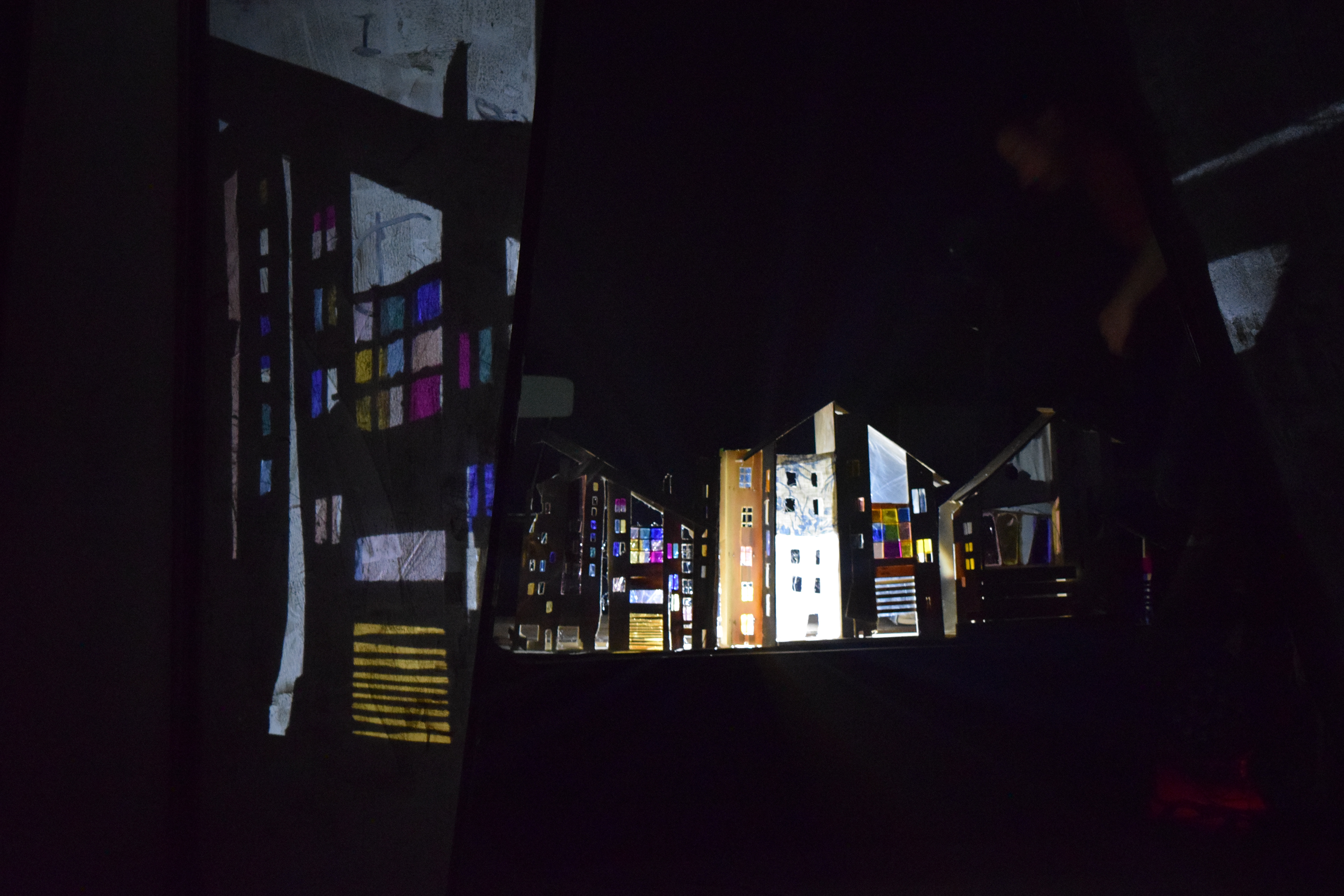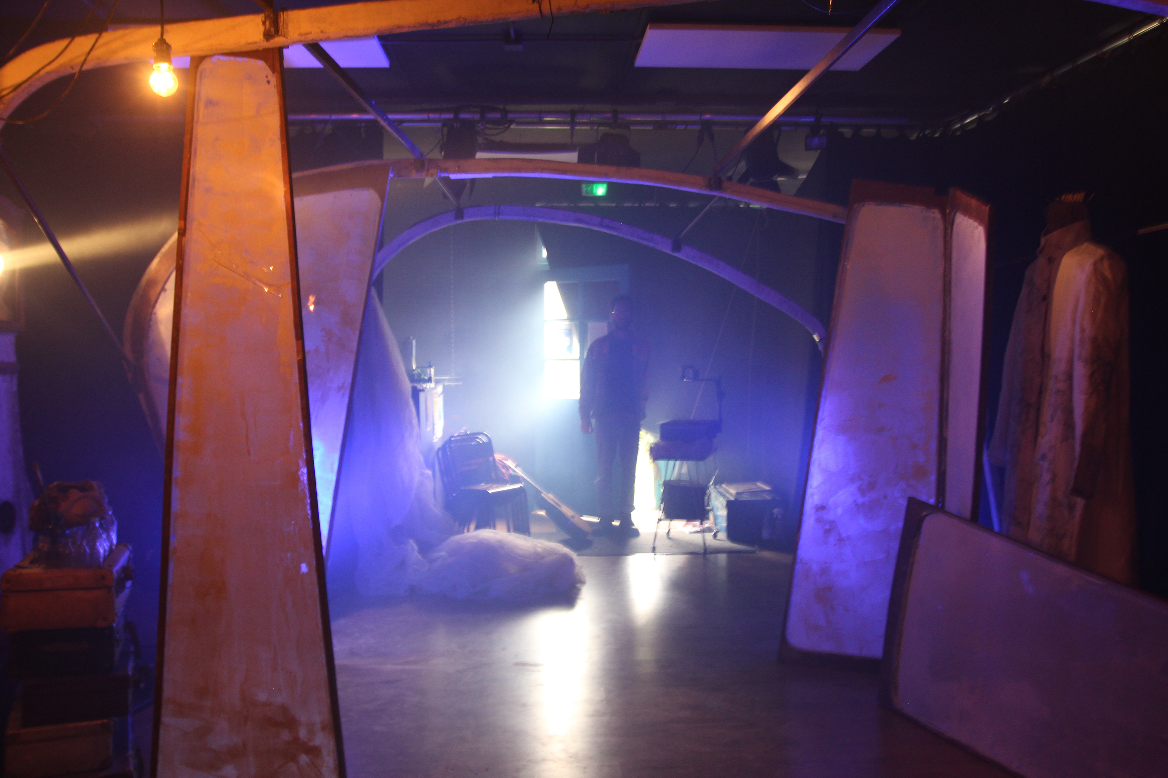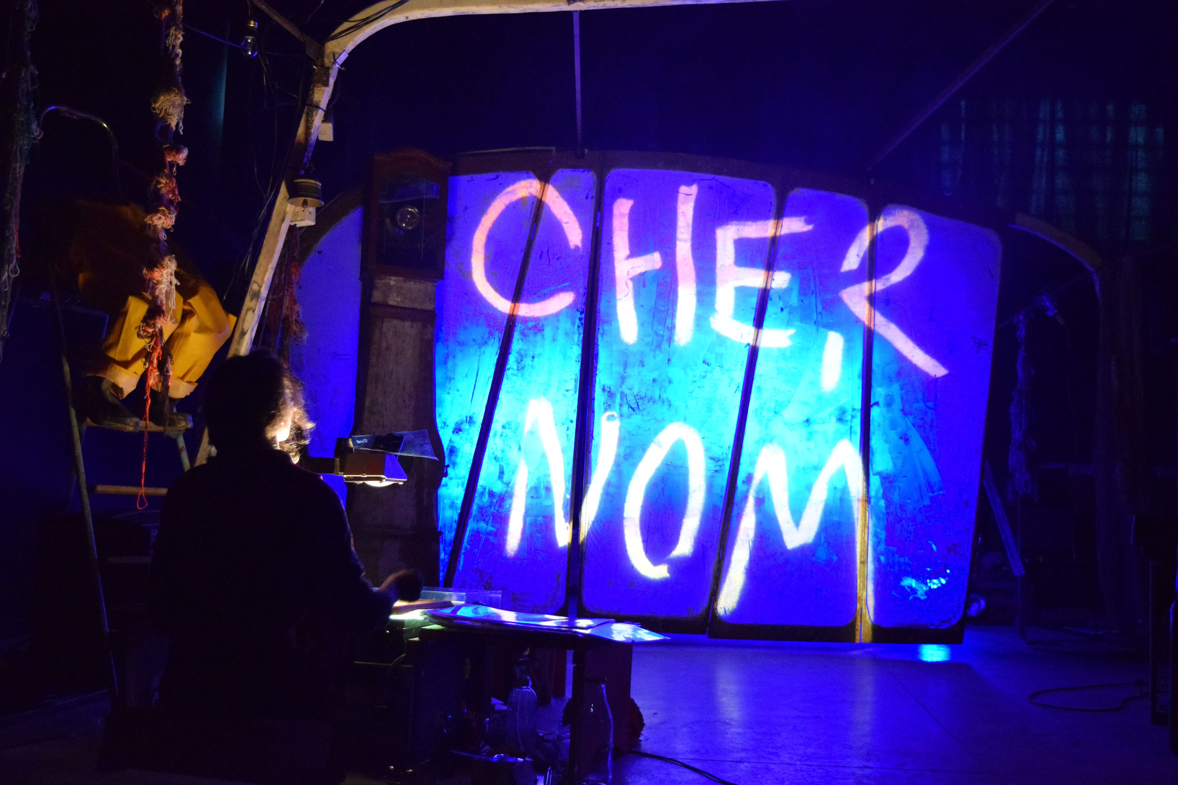 L'espace du spectacle de « Celle qui dit qu’elle a perdu son nom » ressemble autant à une cabane contre laquelle le vent aurait trop soufflé, qu’au squelette d'une baleine biscornue qui nous aurait proposé un abri. Les visiteurs entrent dans ce monde en mouvement, y prennent place. Au-dessus de leurs têtes, des arches tordues s'enchaînent, se rétrécissant légèrement. Un pêcheur sans visage s'articule derrière eux. Une forêt pousse tout à coup et une ville se réveille lentement. Au-delà des fenêtres, des personnages apparaissent puis s’effacent.