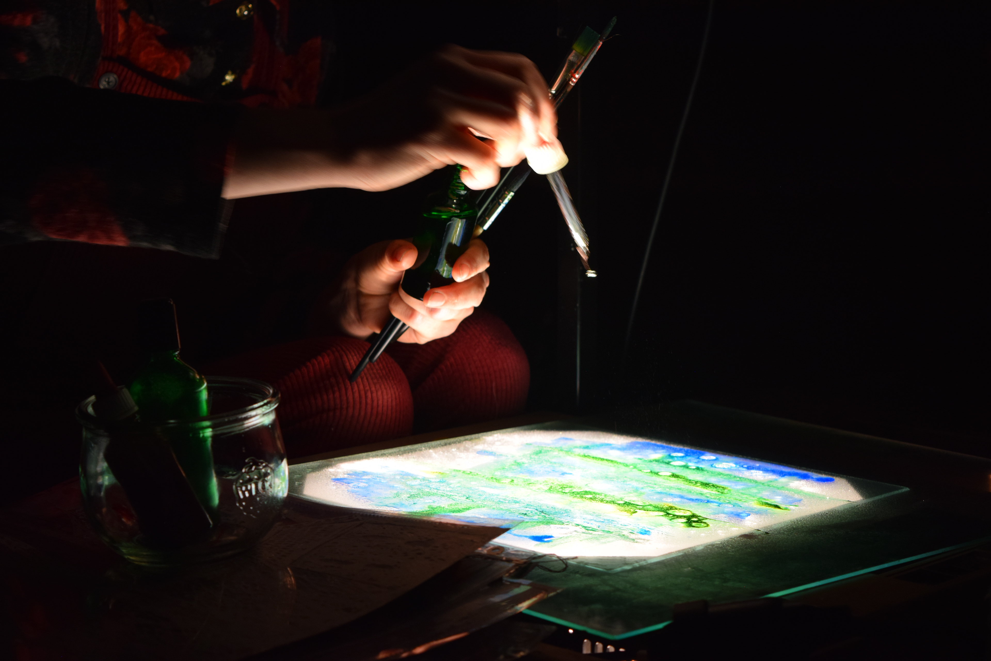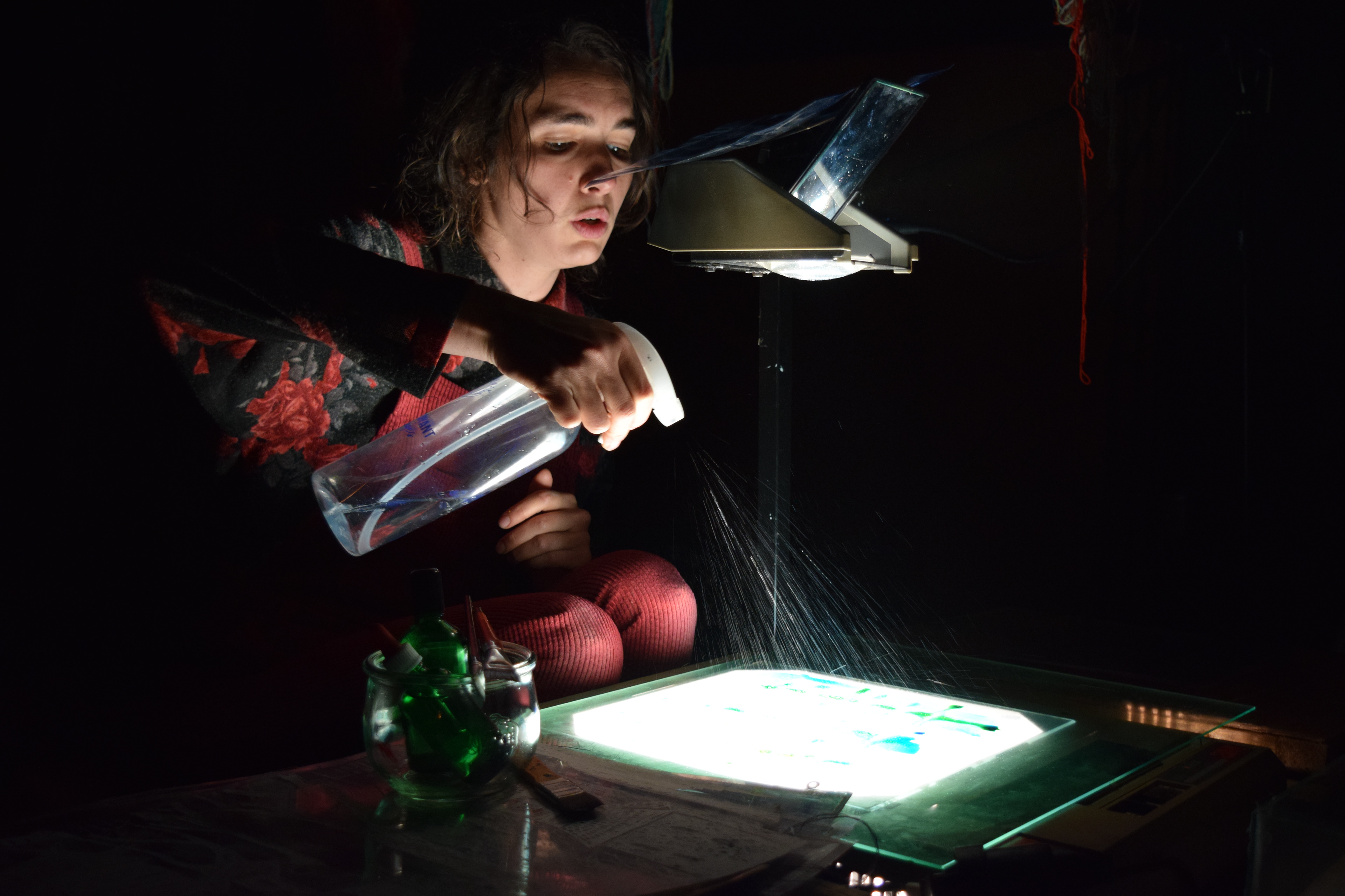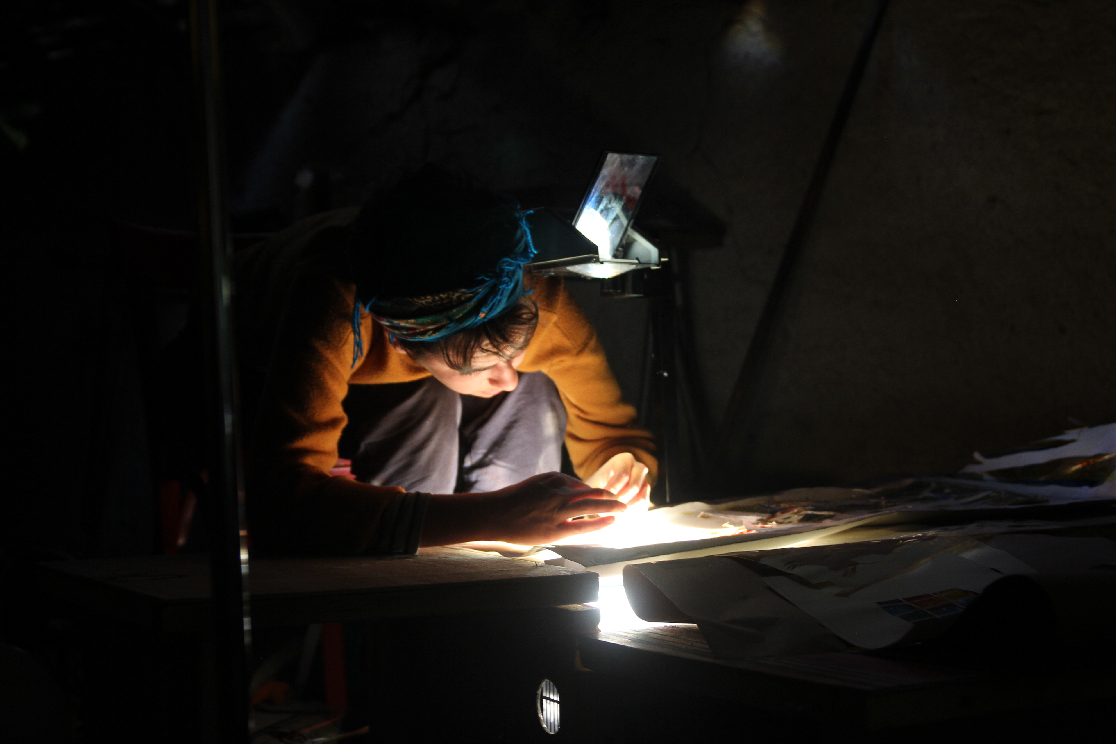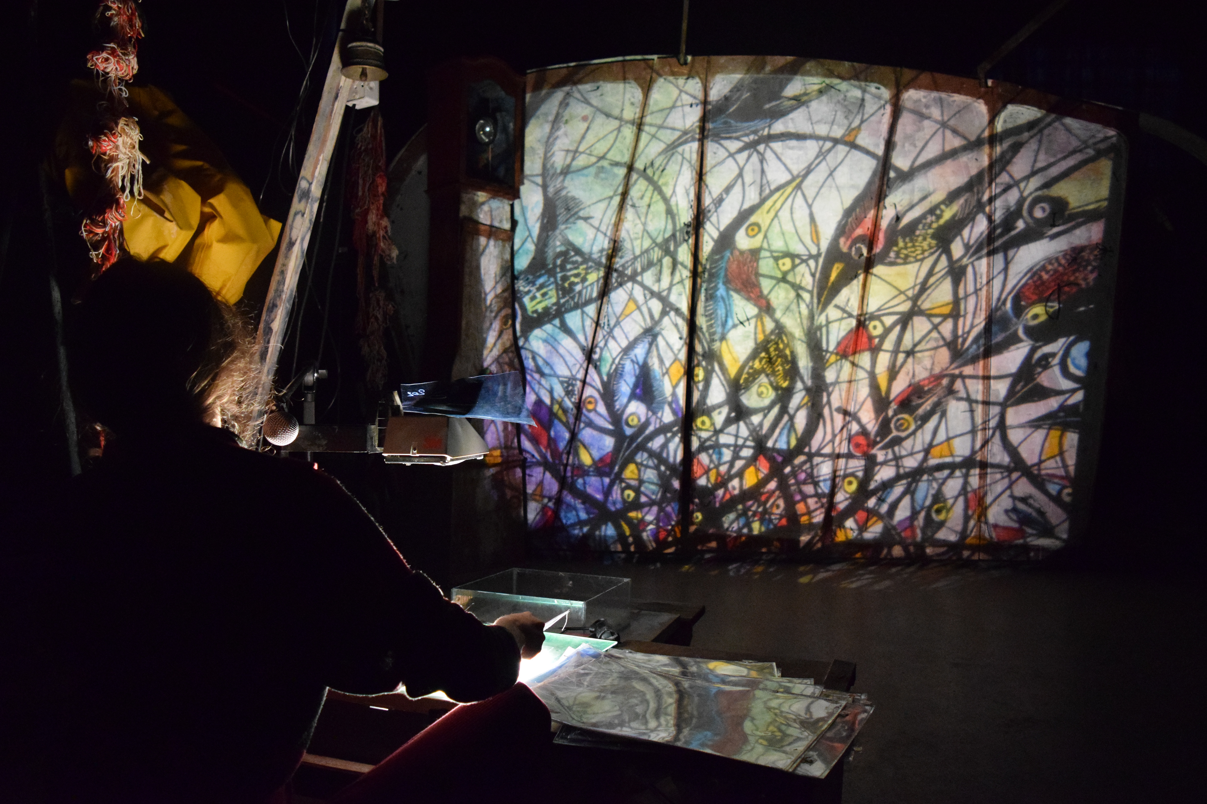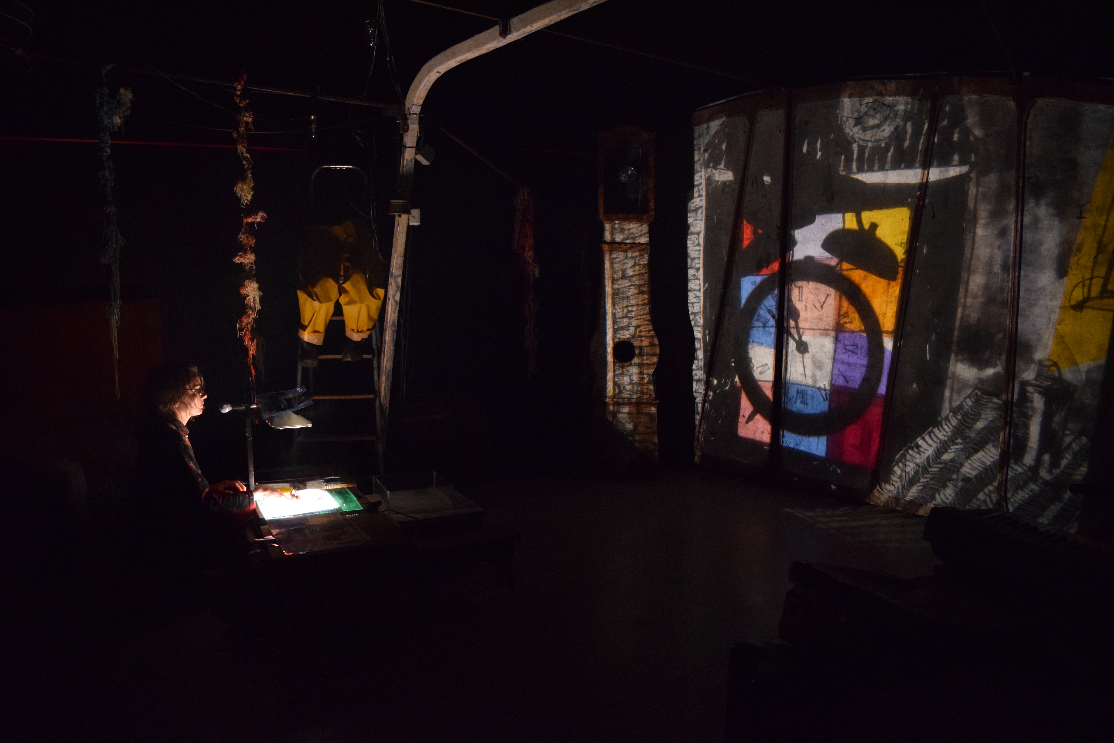 Sa poétique s’exprime à travers des formes artistiques variées - Alter- nance de dessins, de collages, d’images photographiques, de marion- nettes, de matières et de jeux d’ombres.